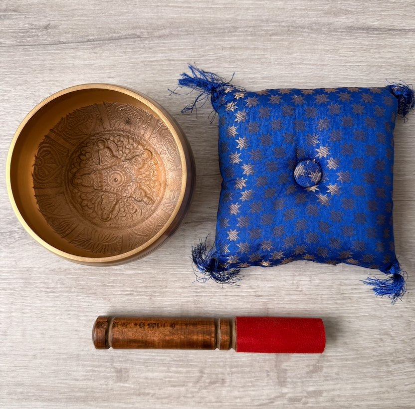 Incluye una baqueta de madera con recubrimiento en piel, perfecta para generar vibraciones suaves o intensas según tu intención, y un cojín en seda que protege el cuenco y realza su belleza (color aleatorio según stock).
